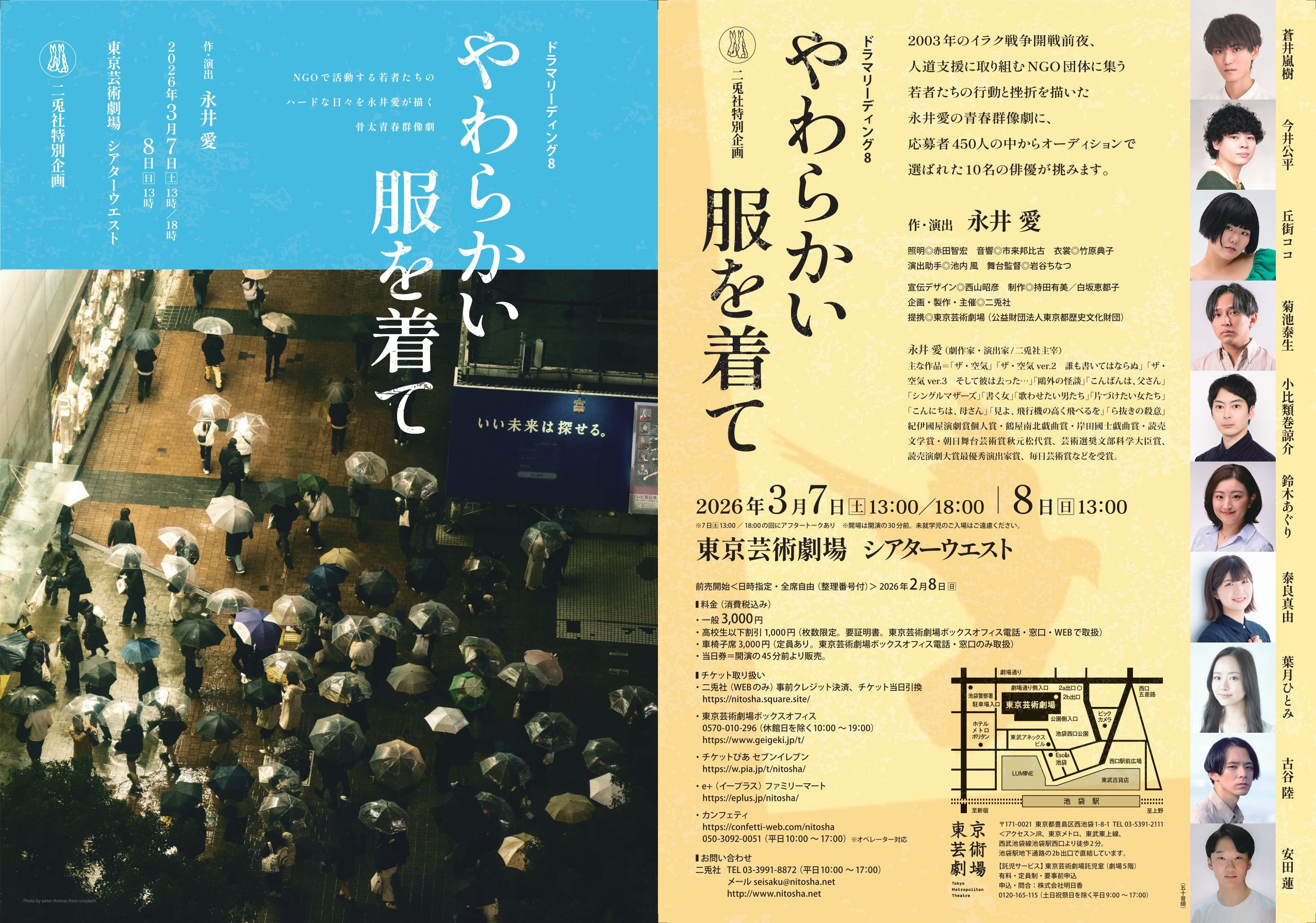 2003年のイラク戦争開戦前夜、人道支援に取り組むNGO団体に集う若者たちの行動と挫折を描いた永井愛の青春群像劇に、応募者450人の中からオーディションで選ばれた10名の俳優が挑みます。